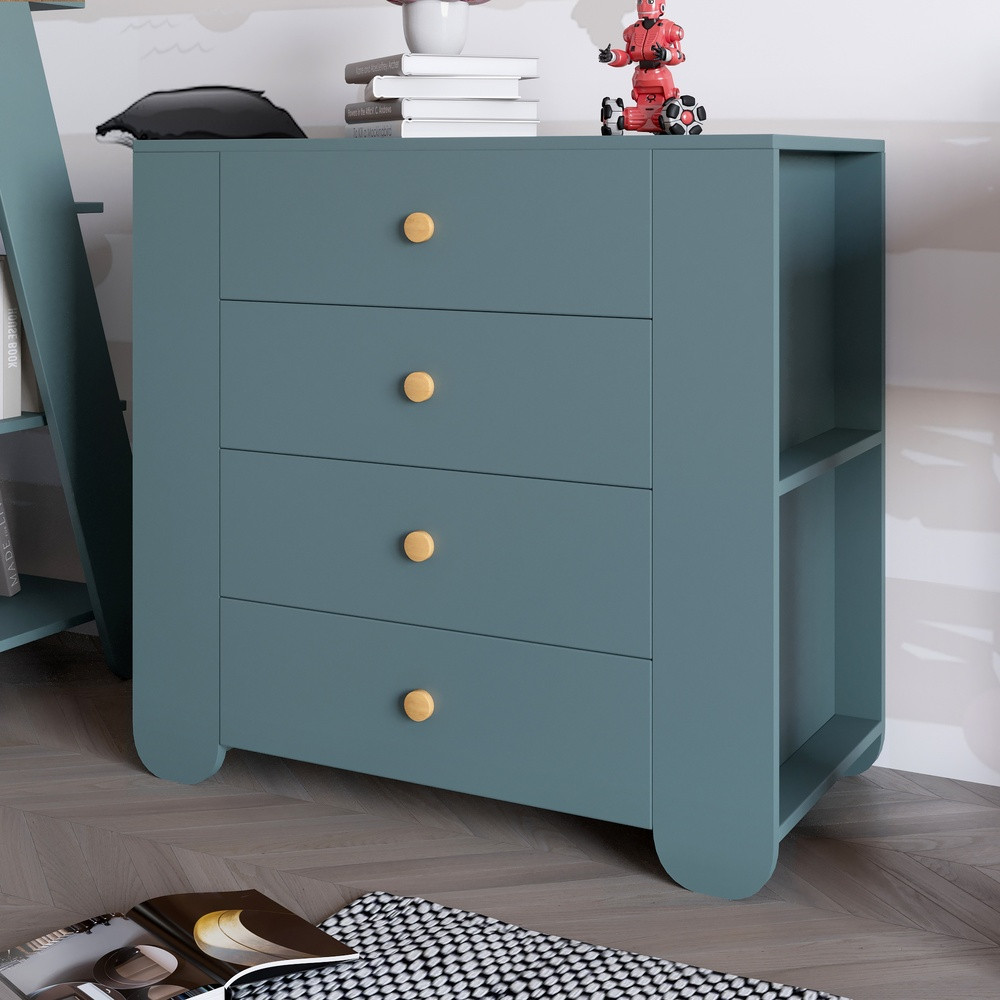 Цей комод обладнаний чотирма просторими шухлядами, що дозволяють зручно зберігати одяг, іграшки та інші речі. Додаткові бічні ніші створюють можливість для зберігання книг або декоративних елементів, надаючи кімнаті особливого шарму. Ваша дитина зможе легко підтримувати порядок, а ви зможете насолоджуватися стильним виглядом меблів.