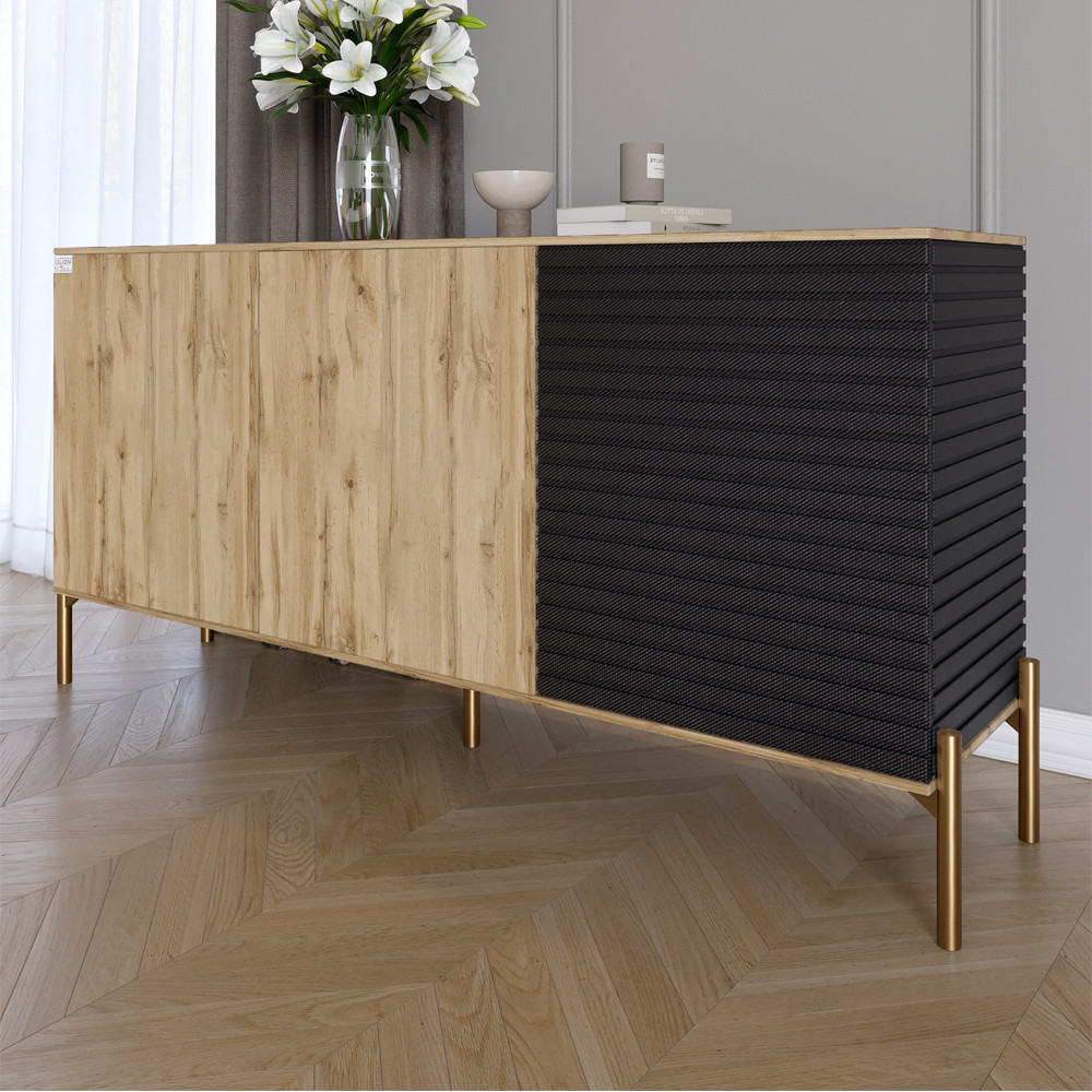 Комод LION Грей - це втілення сучасного стилю та функціональності. Виготовлений із високоякісних матеріалів, він поєднує в собі елегантність форм і вишукані текстури, які привертають увагу. Гладкий фасад доповнений текстурною секцією, що створює цікавий візуальний акцент, а металеві золоті ніжки надають легкості та стабільності. Просторі секції всередині комода дозволяють організовано зберігати одяг, постільну білизну, аксесуари та документи, роблячи його універсальним вибором для спальні, вітальні або робочого кабінету.