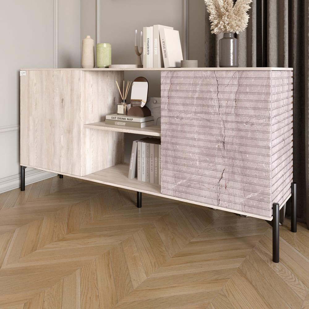 Завдяки використанню ЛДСП SWISS KRONO, комод забезпечує високу стійкість до механічних пошкоджень та вологи, гарантуючи довговічність та збереження естетичного вигляду на багато років. Три функціональні відділення забезпечують організоване зберігання, а мінімалістичний стиль без виступаючих ручок робить його безпечним у використанні. Високий просвіт між підлогою та комодом спрощує прибирання, а стильний дизайн підкреслює індивідуальність вашого простору.